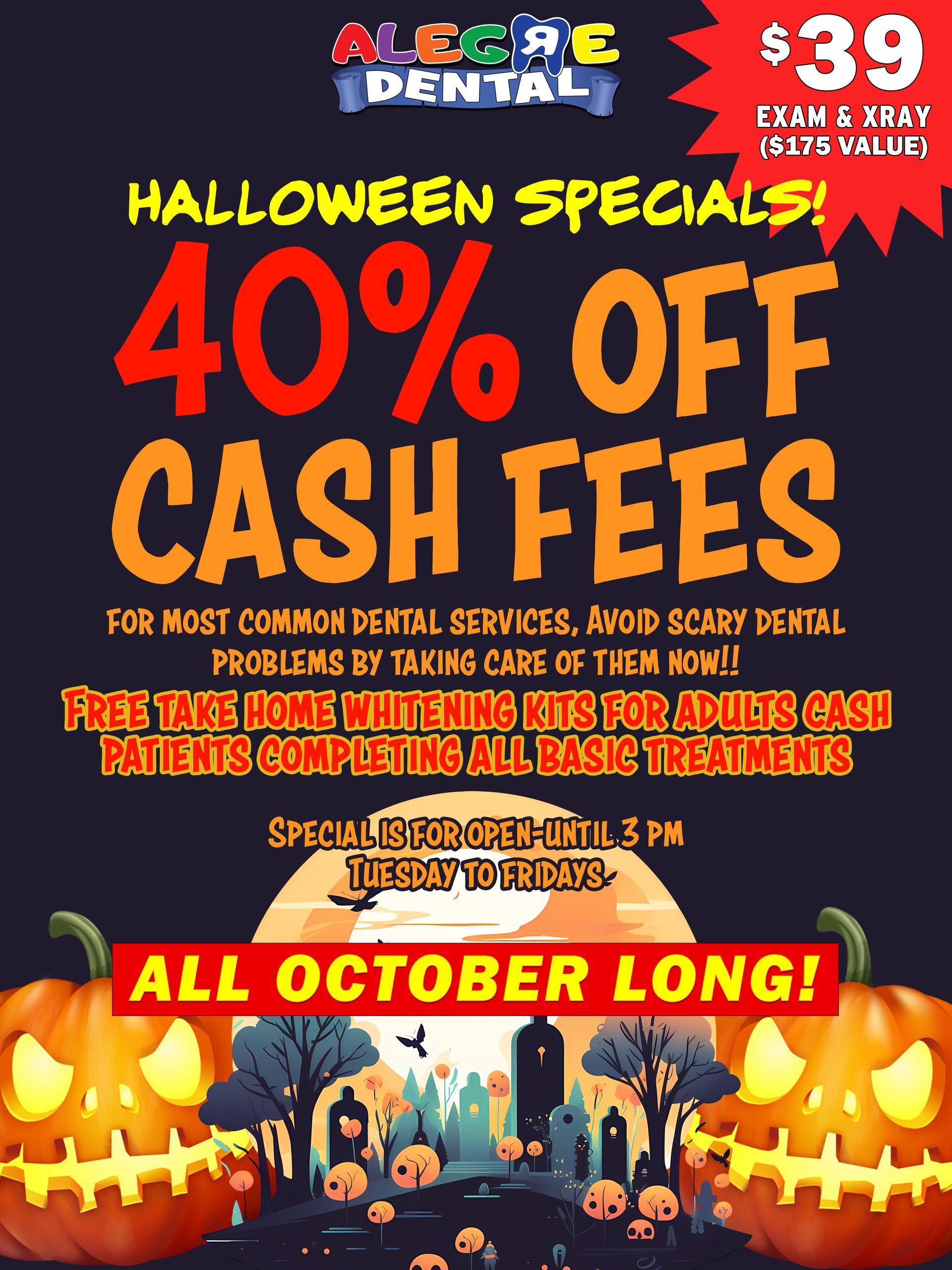 Our Halloween specials are here for a limited time only, so don’t miss out on these exclusive offers! Call us or visit our website to secure your appointment before it’s too late. Remember, at Alegre Dental, we’re turning tricks into treats for your smile!